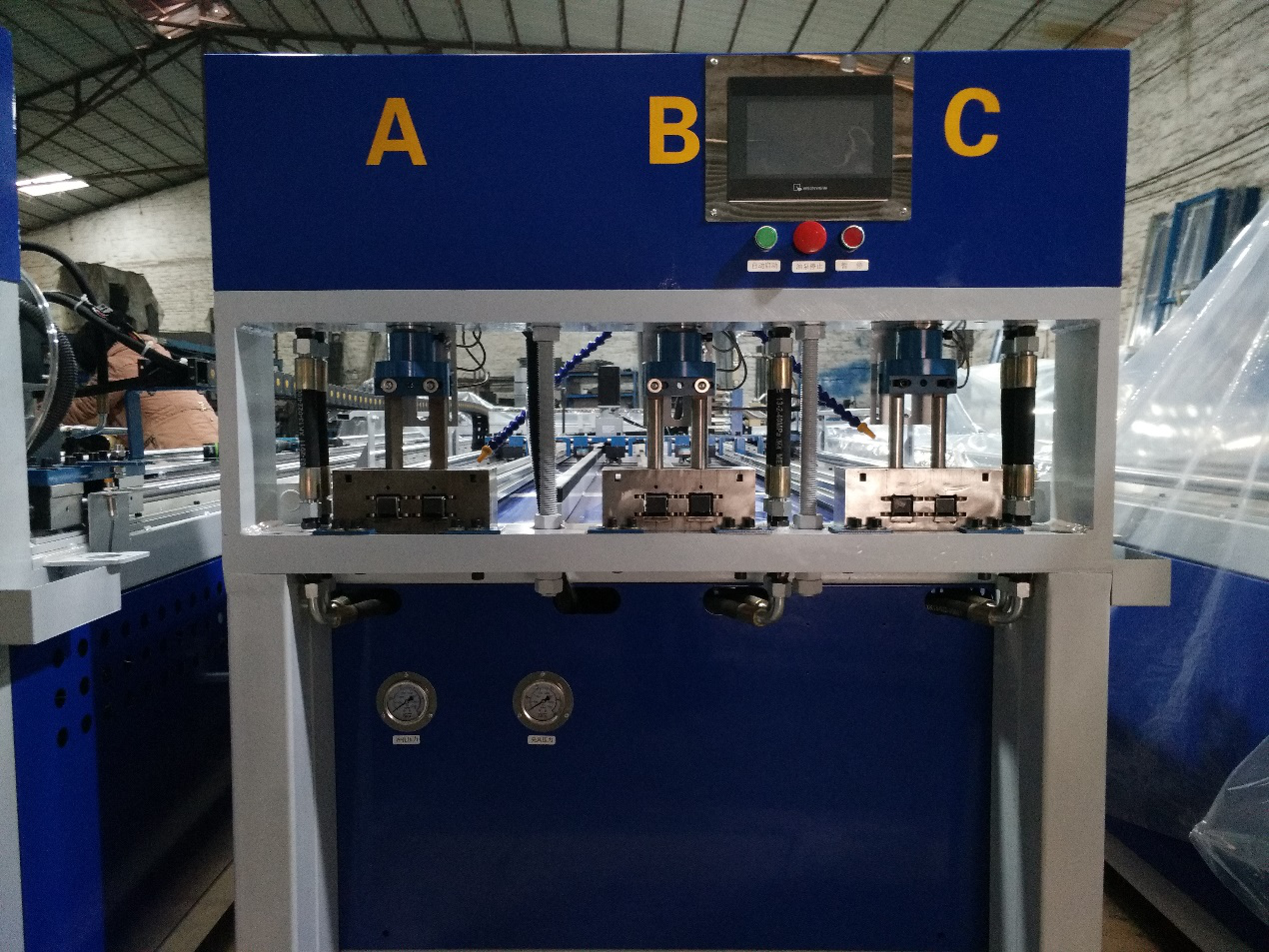 三工位數控全自動沖孔機,三工位同時工作,一次沖6支管,每個油缸可單獨控制沖全孔、半孔,大大提高不銹鋼防盜網沖孔效率,行業(yè)首創(chuàng),專利產品